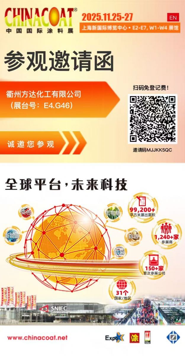 當(dāng)“碳達峰、碳中和”成為全球涂料行業(yè)的共同命題,一場關(guān)于綠色原料的“革命”正在悄然發(fā)生——衢州方達化工有限公司率先交出高分答卷!2025年11月25-27日,上海新國際博覽中心(SNIEC),方達化工將攜“專注新材料領(lǐng)域,用綠色原料編織低碳未來”的硬核實力,震撼亮相中國國際涂料展(CHINACOAT 2025)E4.G46展臺。